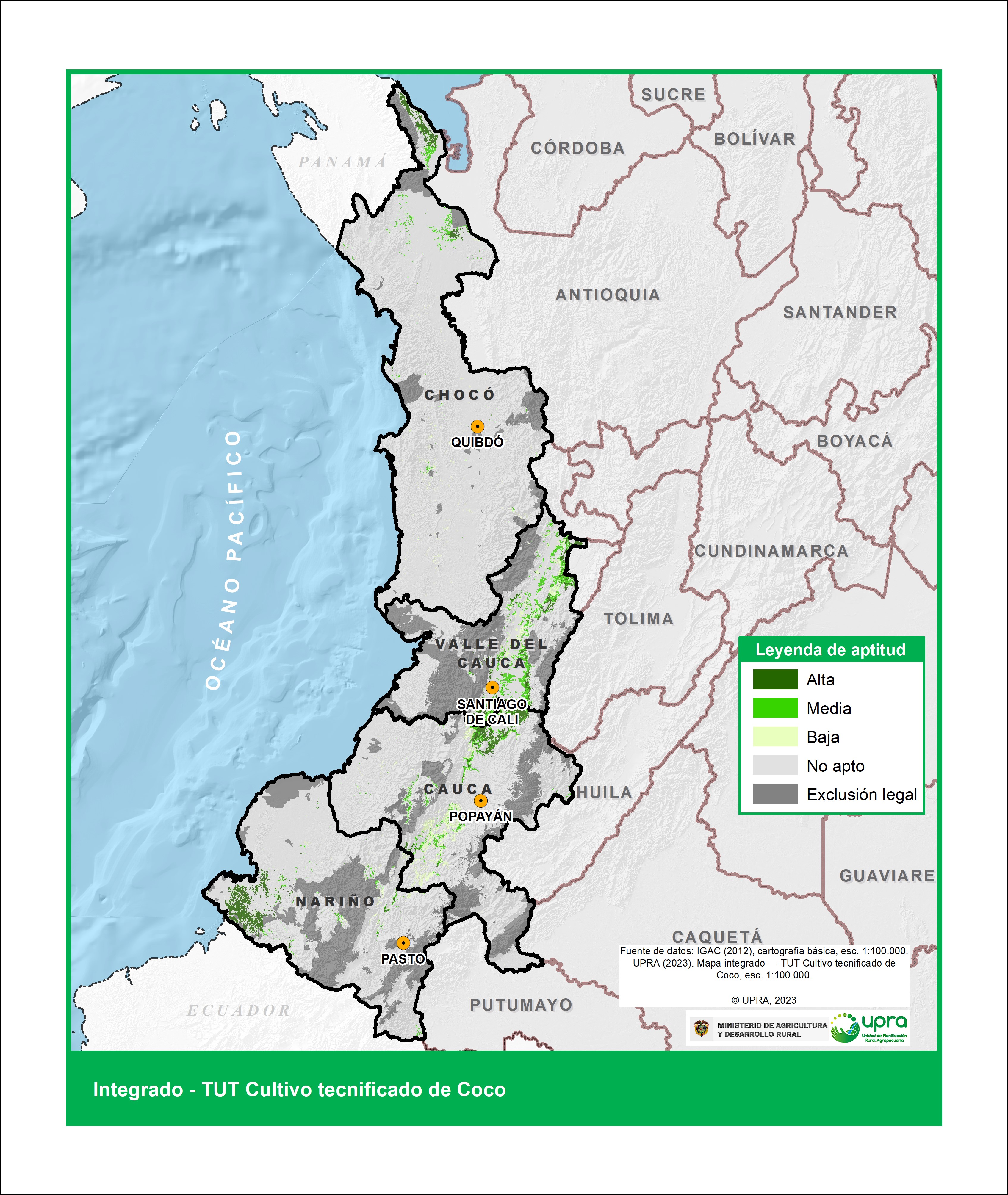 Description: <DIV STYLE="text-align:Left;"><DIV><DIV><P><SPAN>Mediante un mandato del Ministerio de Agricultura y las Secretarías de Agricultura Departamentales se viene fortaleciendo el subsector cocotero en la región del el Andén Pacífico (Nariño, Cauca, Valle y Choco). La UPRA apoya el proceso de Evaluación de Tierras con Fines agropecuarios a escala 1:100.000</SPAN><SPAN>, </SPAN><SPAN>en el que se busca fortalecer la gestión de información sectorial y su respectiva articulación con el sistema de planeación agropecuario en </SPAN><SPAN>l</SPAN><SPAN>a región del Pacifico con otros instrumentos y herramientas para contribuir a la productividad y competitividad.</SPAN></P><P><SPAN>El proceso de evaluación de tierras es un instrumento de planificación para las áreas rurales que facilita la identificación de áreas geográficas con una combinación de características físicas, biológicas, humanas e institucionales aptas para un uso determinado, que pueden ser interpretadas en términos de objetivos para la gestión de los territorios.</SPAN></P><P><SPAN>Aplicar la metodología de evaluación de tierras con fines agropecuarios a escala 1:100.000 en los departamentos del Andén Pacífico Colombiano, significará tener unos mapas de aptitud como herramientas que permitirán identificar posibles núcleos de desarrollo, orientarán políticas del sector agropecuario y de la planificación rural de la región.</SPAN></P><P><SPAN>Se tendrán como fuentes de información principal: El estudio general de suelos y zonificación de tierras </SPAN><SPAN>de los de</SPAN><SPAN>partamentos de Nariño, Cauca, Valle del Cauca y Chocó, mapa de coberturas y usos de la tierra dentro de la frontera agrícola actualizadas por la Upra a escala 1:100.000, mapa de frontera agrícola oficial, exclusiones legales y condicionantes, información climática del Ideam, y evaluaciones agropecuarias municipales.</SPAN></P><P><SPAN>Los mapas del TUT de Coco: estarán zonificados con las siguientes categorías: Aptitud alta (A1), Aptitud media (A2), Aptitud baja (A3), No apto técnico (N1), No apto legal (N2). Cada mapa tendrá las estadísticas por categoría de aptitud total para la región del Andén Pacifico Colombiano.</SPAN></P></DIV></DIV></DIV>