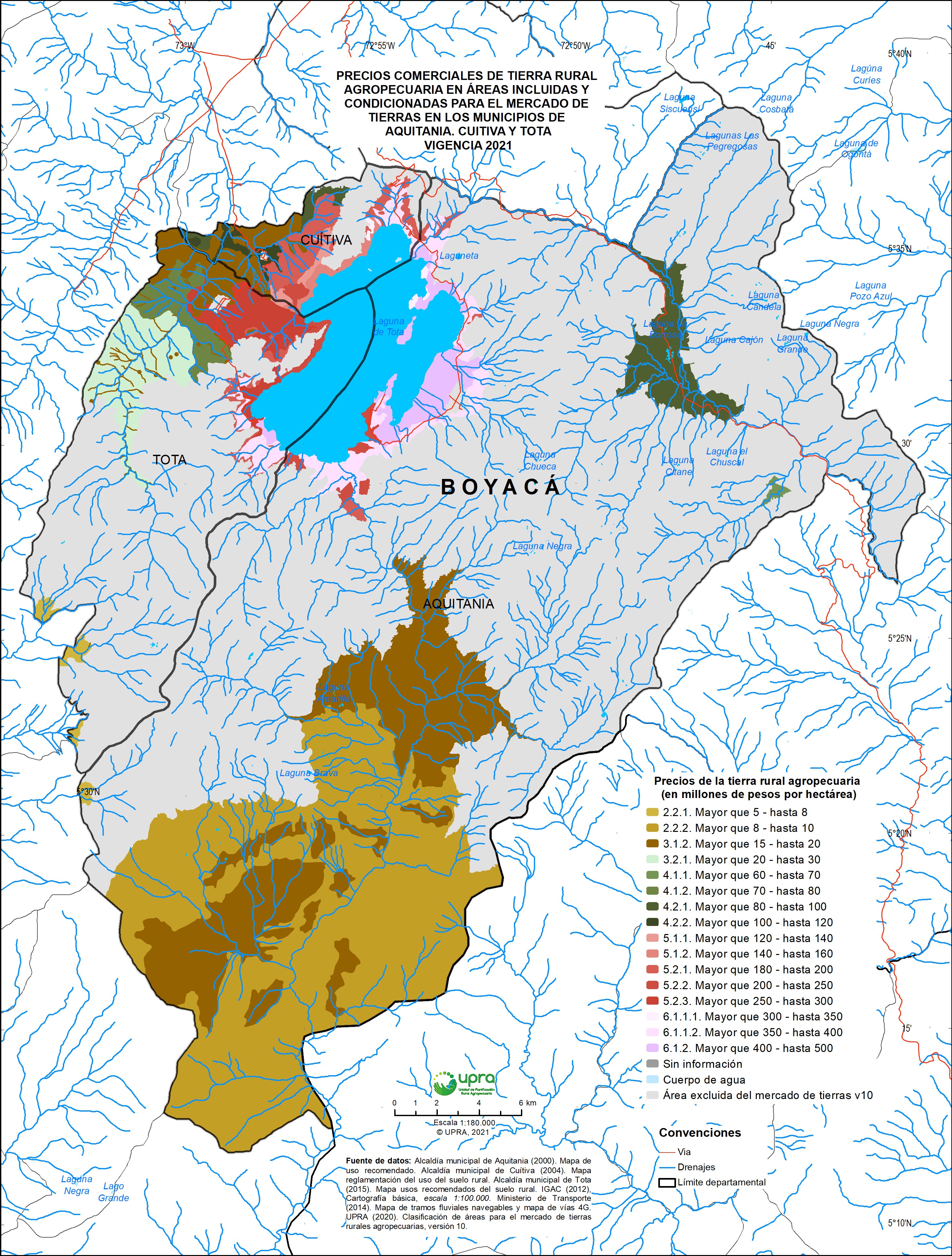 Description: <DIV STYLE="text-align:Left;"><DIV><DIV><P><SPAN>El mapa de precios comerciales de la tierra rural es la línea base para el monitoreo y proyección del comportamiento de los precios rurales del departamento, y es un insumo para la orientación, formulación, seguimiento y evaluación de políticas públicas en el ámbito Nacional y Departamental. La divulgación de esta información es una acción afirmativa de transparencia del mercado de tierras, con la cual se pretende contribuir a su regularización. Se prepara la elaboración de este mapa en el cual se emplearon y analizaron como insumos las capas que se relacionan a continuación:Alcaldía municipal de Aquitania (2000). Mapa de uso recomendado. Alcaldía municipal de Cuítiva (2004). Mapa reglamentación del uso del suelo rural. Alcaldía municipal de Tota (2015). Mapa usos recomendados del suelo rural. IGAC (2012), Cartografía básica, escala 1:100.000. Ministerio de Transporte (2014). Mapa de tramos fluviales navegables y mapa de vías 4G. UPRA (2020). Clasificación de áreas para el mercado de tierras rurales agropecuarias, versión 10. El precio de la tierra rural se determinó principalmente mediante la utilización de datos producto de entrevistas semiestructuradas a diferentes actores estratégicos e idóneos en los municipios anteriormente mencionados, relacionados con las dinámicas del comportamiento del precio de tierra rural; por la contingencia de la pandemia presentada en el 2020 (Covid-19) y que continúa para la presente vigencia, esta labor se realizó de manera virtual mediante herramientas de comunicación remota y espacialización (geovisor) que permitió efectuar una labor interactiva con los diferentes actores. Este trabajo se complementó con estudios de mercado inmobiliario y de ofertas encontradas mediante diferentes páginas web. Posteriormente se realizó la caracterización del territorio en estudio y se efectuó el trazado de los polígonos de rangos de precios. Por la naturaleza y alcance previsto para este trabajo NO se llevó a cabo un muestreo estadístico, pero se realizaron entrevistas semiestructuradas a personas, entidades y agremiaciones idóneas en el tema agropecuario de esta zona del departamento de Boyacá. En términos generales, los rangos de pecios de la tierra presentados en el mapa corresponden predominantemente a precios de tierras rurales agropecuarias (mezclado con esa fuerte tendencia y posicionamiento del uso turístico) y NO incluyen precios de la tierra de predios con usos urbanos, comerciales y de servicios.</SPAN></P><P><SPAN>A continuación, a manera de resumen, se presentan los principales resultados:</SPAN></P><P><SPAN>En el rango hasta 10 millones de pesos por hectárea se encuentra ubicado aproximadamente el 42,5 % (17.183,84 hectáreas) de las áreas condicionadas e incluidas para el MT; se ubican mayoritariamente en el municipio de Aquitania, seguido del municipio de Tota. El municipio de Cuítiva no presenta áreas con este rango de precio. Los tiempos de desplazamiento para algunas zonas es de hasta 6 horas.</SPAN></P><P><SPAN>En el rango mayor que 10 y hasta 60 millones de pesos por hectárea se encuentra ubicado aproximadamente el 33,3 % (13.499,52 hectáreas) de las áreas condicionadas e incluidas para el MT; se ubican principalmente en el municipio de Aquitania, seguido de los municipios de Tota y Cuítiva. Los tiempos de desplazamiento es de hasta 4 horas para algunas zonas.</SPAN></P><P><SPAN>En el rango mayor que 60 y hasta 120 millones de pesos por hectárea se encuentra ubicado aproximadamente el 8 % (3.202,48 hectáreas) de las áreas condicionadas e incluidas para el MT; se ubican principalmente en el municipio de Aquitania, seguido de los municipios de Tota y Cuítiva. Tiempos de desplazamiento de hasta 2 horas para la mayoría de las zonas que tienen este rango.</SPAN></P><P><SPAN>En el rango mayor que 120 y hasta 300 millones de pesos por hectárea se encuentra ubicado aproximadamente el 8,9 % (3.580,98 hectáreas) de las áreas condicionadas e incluidas para el MT; se ubican principalmente en el municipio de Tota, seguido de los municipios de Cuítiva y Aquitania. Existen tiempos de desplazamiento que en general son menores a 1 hora.</SPAN></P><P><SPAN>Por último, en el rango mayor que 300 y hasta 500 millones de pesos por hectárea se encuentra ubicado aproximadamente el 7,4 % (2.981,48 hectáreas) de las áreas condicionadas e incluidas para el MT; se ubica de manera predominante en el municipio de Aquitania, seguido de Tota y Cuítiva. La principal actividad económica obedece principalmente al turismo que atrae el Lago de Tota, aunado a la disponibilidad de alojamientos y servicios complementarios (restaurantes, actividades acuáticas y ecológicas, entre otras). Se tienen tiempos de desplazamientos menores a 1 hora e igualmente predios con áreas de terreno generalmente menores a 3 ha. Obedece principalmente a predios ubicados entre el lago y la cabecera urbana del municipio de Aquitania.</SPAN></P></DIV></DIV></DIV>