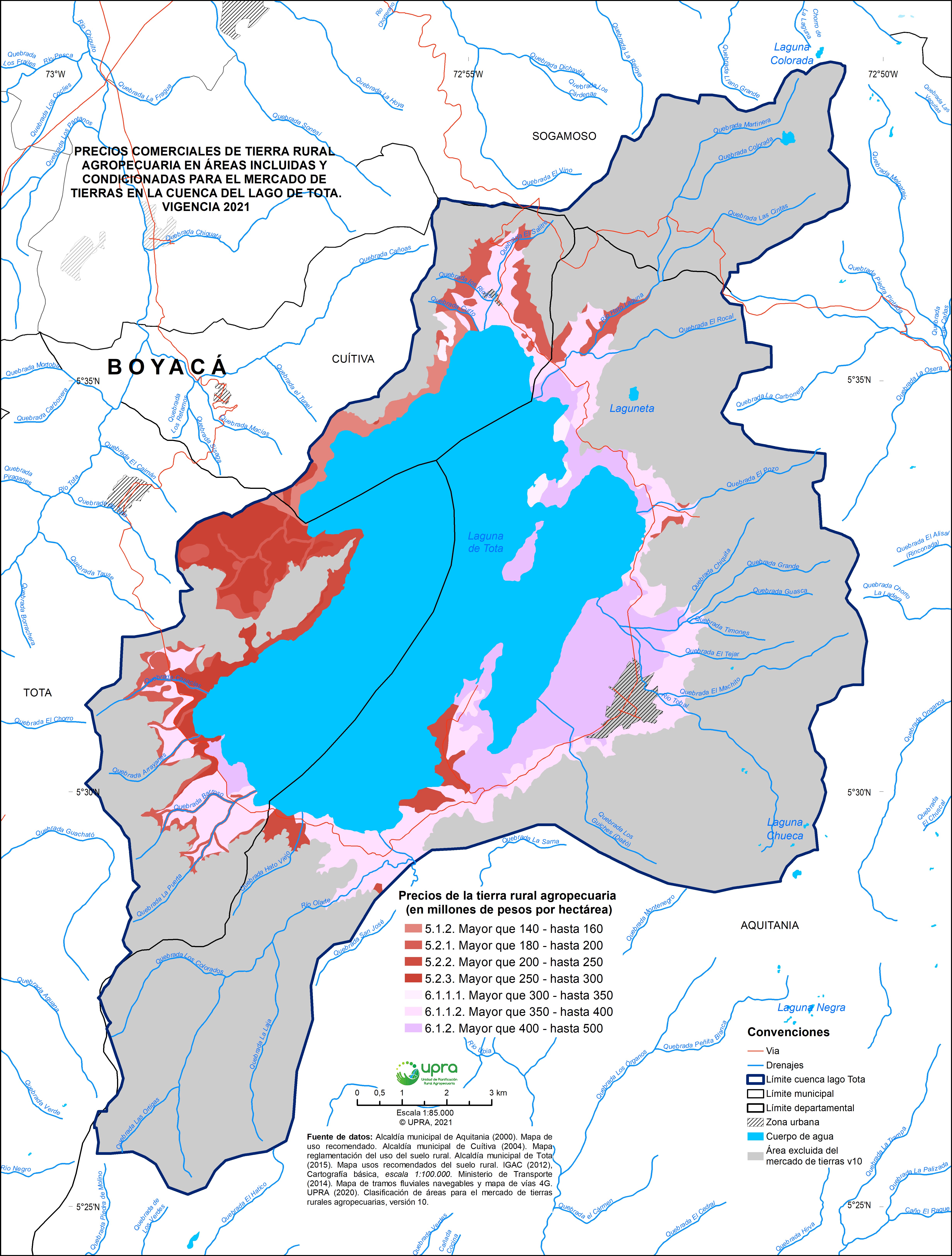 Alcaldía municipal de Cuítiva. (2004). Mapa reglamentación del uso del suelo rural. Alcaldía municipal de Tota. (2015). Mapa usos recomendados del suelo rural. Instituto Geográfico Agustín Codazzi (IGAC). (2012), Cartografía básica, escala 1:100.000. Ministerio de Transporte. (2014). Mapa de tramos fluviales navegables y mapa de vías 4G. Unidad de Planificación Rural Agropecuaria (UPRA). (2020). Clasificación de áreas para el mercado de tierras rurales agropecuarias, versión 10.